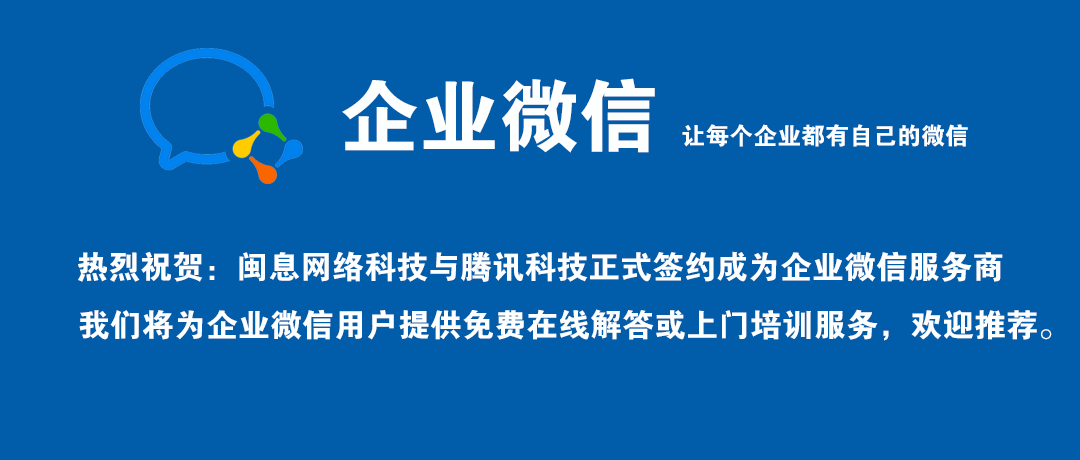 热烈祝贺:泉州市闽息网络科技有限公司与广州腾讯科技有限公司正式签约为企业微信服务商,我们将秉承客户至上、有问必答的理念为企业微信用户提供免费在线解答或上门培训服务,欢迎推荐!